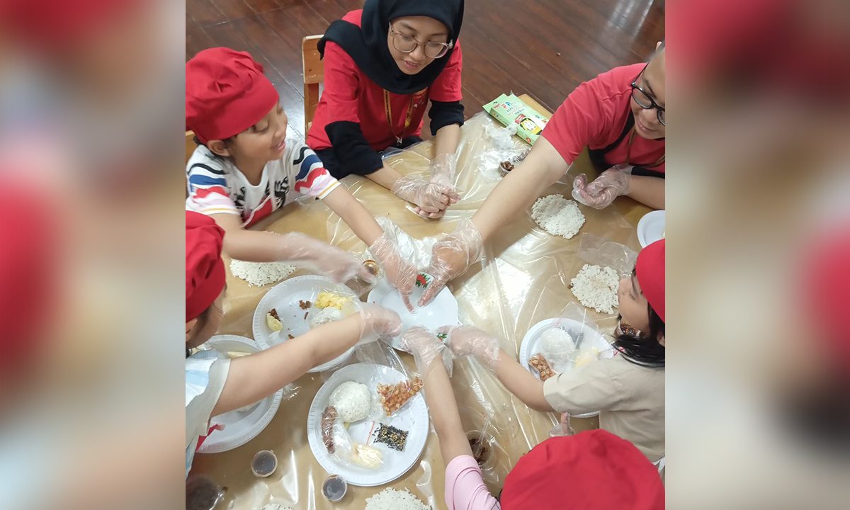 Setelah itu, mereka mulai beraktivitas: mengoles saus, menyusun lapisan burger, membentuk onigiri, atau menghias pancake dengan buah-buahan segar dan topping warna-warni. Di sela-sela kegiatan, instruktur menyelipkan tips praktis yang mudah diingat seperti, “Potong bahan di talenan untuk keamanan” atau “Gunakan sendok untuk mengambil topping agar tetap bersih.”