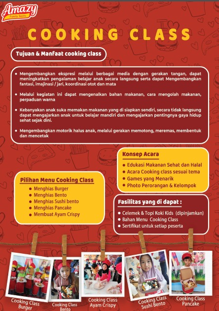 Kamu juga bisa mengikuti berbagai jenis cooking class yang ada di Amazy Family Resto. Jenis cooking class yang ada yakni meliputi Menghias Burger, Membuat Sushi Bento dan juga Menghias Pancake. Selain Cooking class kalian juga bisa mengadakan atau berpartisipasi dalam kegiatan lomba mewarnai bersama Amazy. Acara cooking class dan lomba bisa diselenggarakan langsung di lokasi amazy family resto yang terdekat dari kotamu, atau juga bisa diadakan langsung di sekolahmu, tim dari amazy akan langsung berkunjung kesekolah sehingga tidak perlu repot untuk melakukan kegiatan cooking class bersama amazy. Fasilitas yang akan didapatkan dari setiap paketnya seperti :