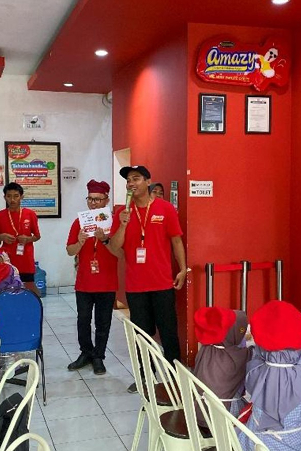 Setelah melakukan kegiatan games, dilanjutkan dengan pembagian sertifikat serta bermain bersama dengan Maskotnya Amazy yaitu AMY. Sehingga menambah keseruan acara cooking class yang membuat anak-anak semakin bersemangat dan ceria pas main bareng dengan si AMY.