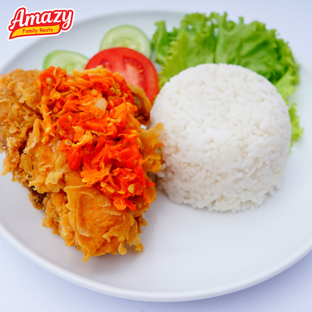 Amazy Family Resto juga punya menu fried chicken yang disajikan dengan topping sambal geprek yang diulek langsung oleh tangan terampil dari tim Amazy, lho. Ayam yang crispy berpadu dengan sensasi super pedas sambal dari cabai asli Indonesia. Kamu bisa memesan menu ini dengan nama Amazy Ayam Geprek Crispy.